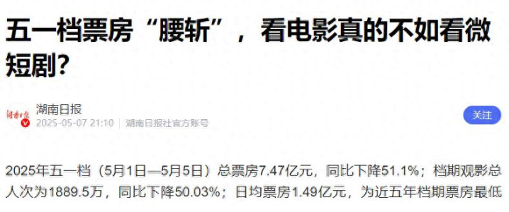 表面上,影院放映数量回升,片单看似热闹非凡;但结果五一档票房票房7.47亿元,同比下降51.1%。这不是冷风过境,这是整个电影工业的溃败呐喊。